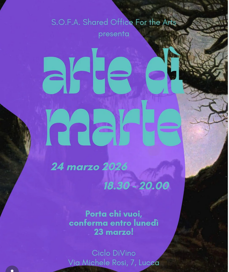 Arte di Marte Tuesday 24 March 2026 18:30 20:00 Ciclo Divino 7 Via Michele Rosi Lucca, Toscana, 55100 Italy (map) Google Calendar ICS We look forward to seeing you on Tuesday, March 24th at @ciclodivino to discuss art over a drink. An opportunity to meet new people, discover or rediscover works of art, and join the s.o.f.a. APS community!