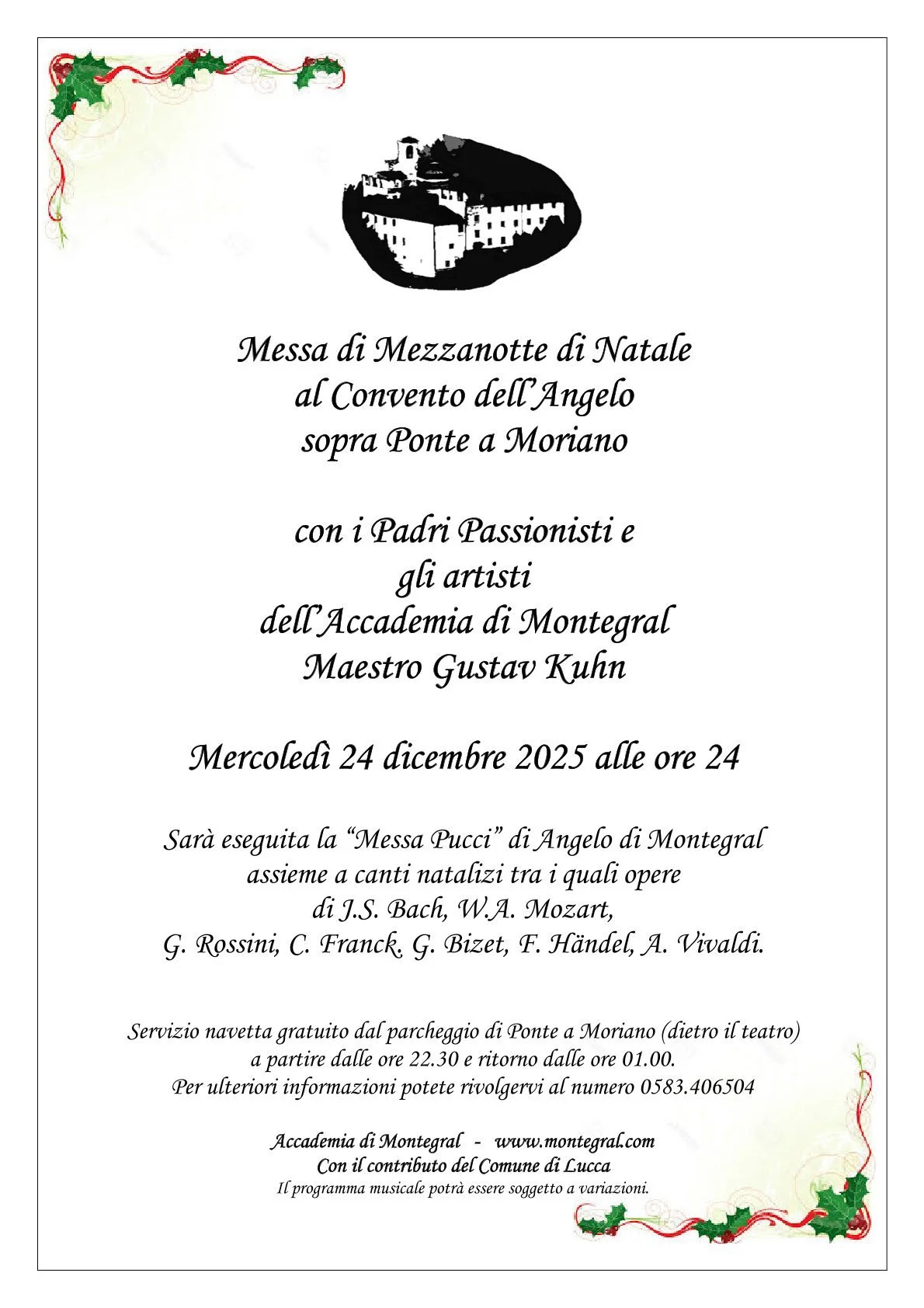 Back to All Events Christmas Eve Midnight Mass Wednesday 24 December 2025 23:59 Thursday 25 December 2025 00:59 Convento dell' Angelo 2530 Via Tramonte Toscana, 55100 Italy (map) Google Calendar ICS Midnight Mass with music by Bach, Franck, Bizet, Handel, Vivaldi and La messa Pucci by Angelo di Montegral with artists from the Monteeral Academy MORE INFO