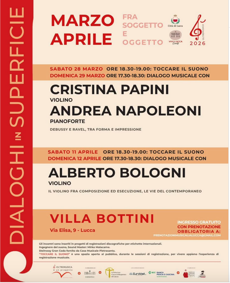 The first event will feature Cristina Papini on the violin and Andrea Napoleoni on the piano! We look forward to seeing you on 28 March for ‘Toccare il suono’ and on 29 March for ‘Dialogo in superficie’.We look forward to seeing you at the new events in the "Dialoghi in Superficie" series at Villa Bottini!