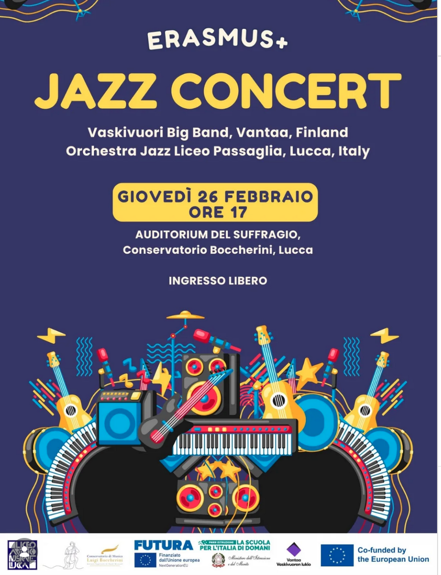 Erasmus + Jazz Concert Thursday 26 February 2026 17:00 19:00 Bocccherini Auditorium 6 Via del Suffragio Lucca, Toscana, 55100 Italy (map) Google Calendar ICS Liceo Artistico Musicale Lucca presents a free jazz concert featuring the Vaskivuori Big Band from Finland and ther Jazaz Orchestra Liceo passaglio at the Boccherini Auditorium