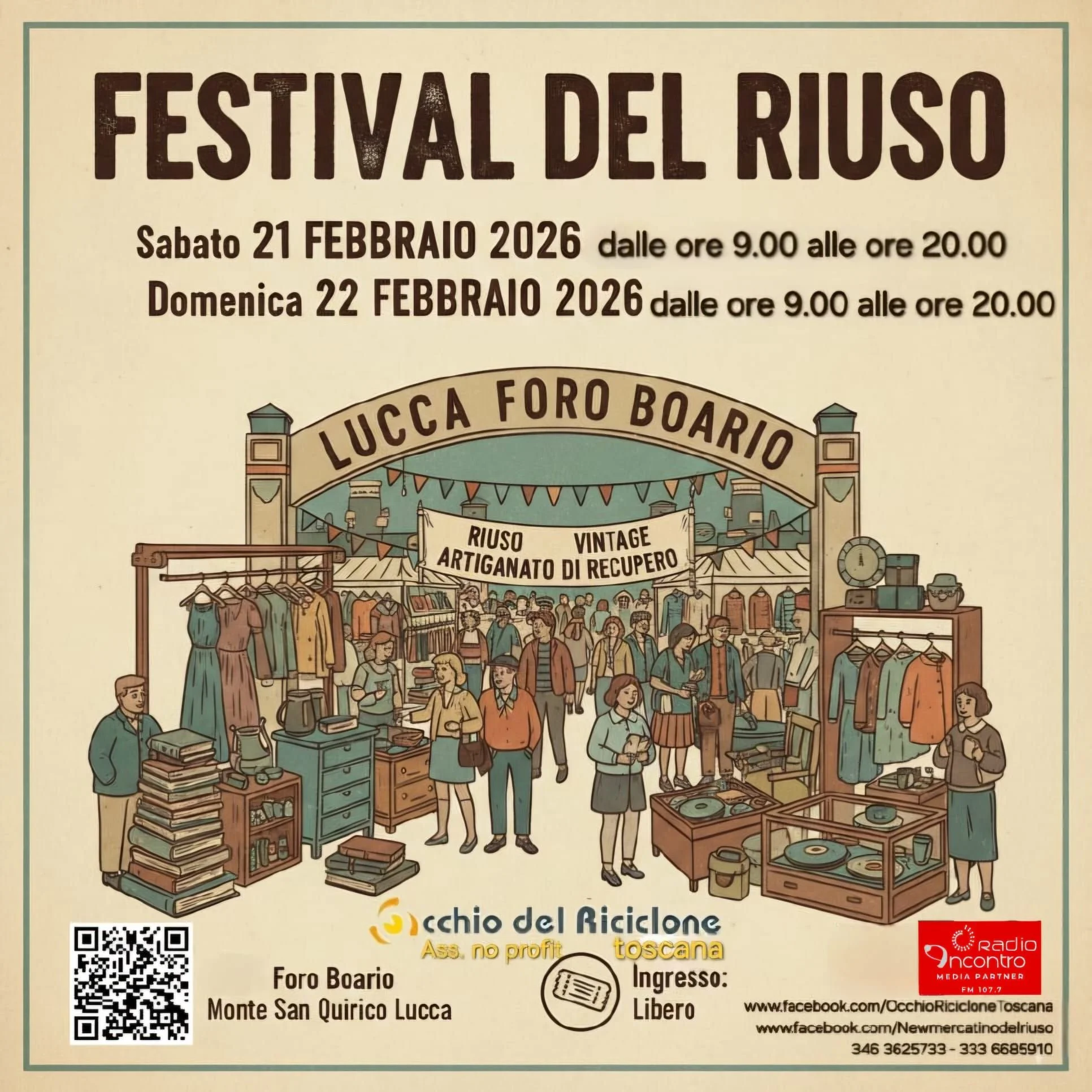 Festival del Riuso Saturday 21 February 2026 09:00 Sunday 22 February 2026 20:00 Foro Boario SP1 Lucca, Toscana, 55100 Italy (map) Google Calendar ICS The Festival del Riuso flea market is back at the Foro Boario this weekend, with vintage items, clothing, homewares and more, a great place to pick up some unique bargains!