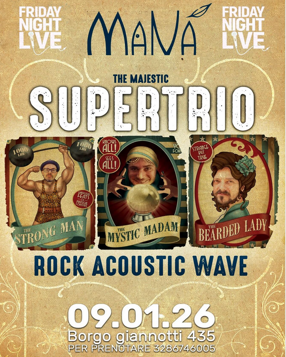 Mana restaurant in Borgo Giannotti live music schedule for January is here with concerts every Friday evening.This Friday Supertrio Acoustic trio performing rock songs, from the classics—Bowie, Pink Floyd, the Beatles, Queen—to the more sophisticated ones like Nirvana, Pearl Jam, Depeche Mode, REM, and many more.
