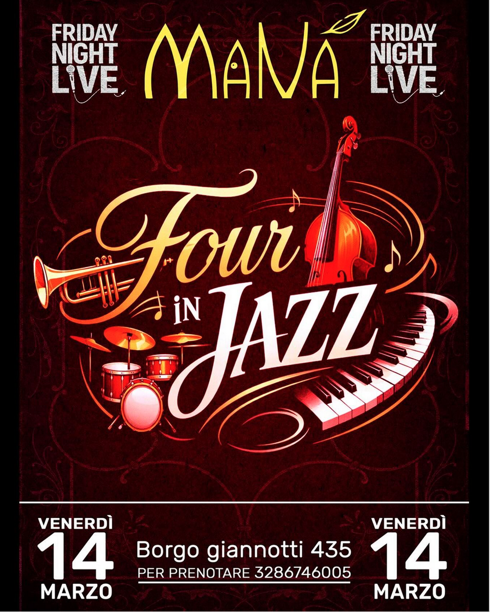 On Saturday 14th, exceptionally not on Friday, there will be live music to accompany your dinner and after-dinner drinks with the Four In Jazz group for a concert dedicated to jazz. 🎺