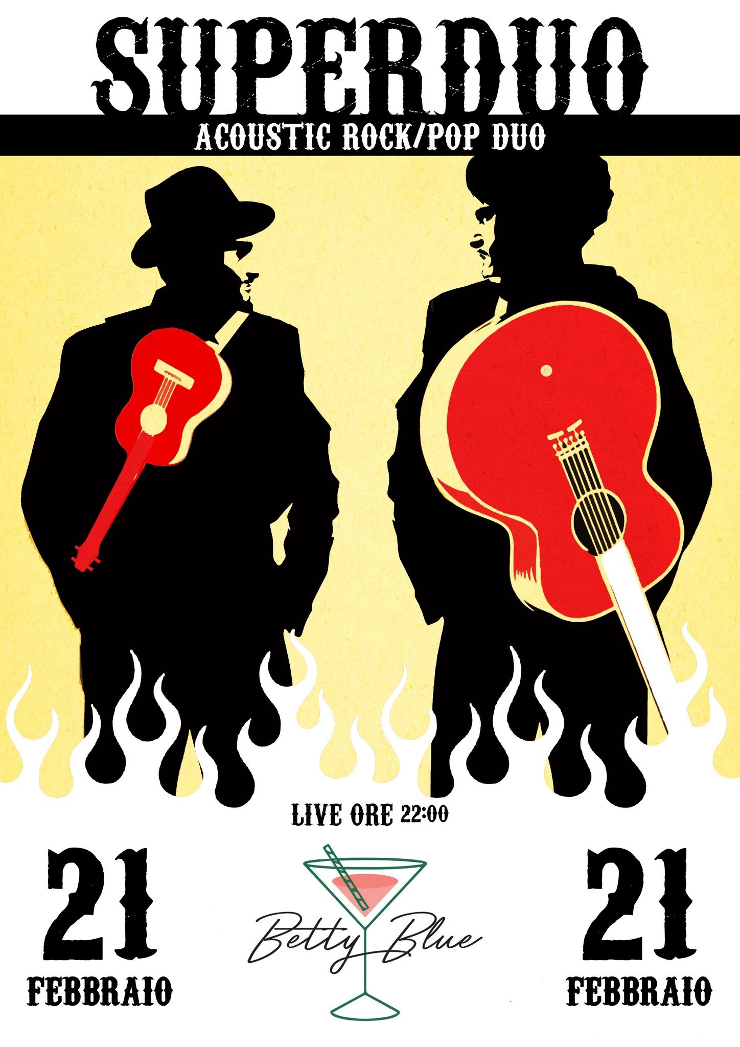 Back to All Events Super Duo Live Music Saturday 21 February 2026 22:00 23:59 Betty Blue (map) Google Calendar ICS Betty Blue presents Superduo and acoustic duo performing acoustic versions of rock and pop songs: from classics such as Bowie, Pink Floyd, The Beatles, and Queen to more obscure artists such as Nirvana, Pearl Jam, Depeche Mode, REM, and many others.The band consists of:Devid Winter on vocals and guitarFederico Taddeucci on vocals and ukulele
