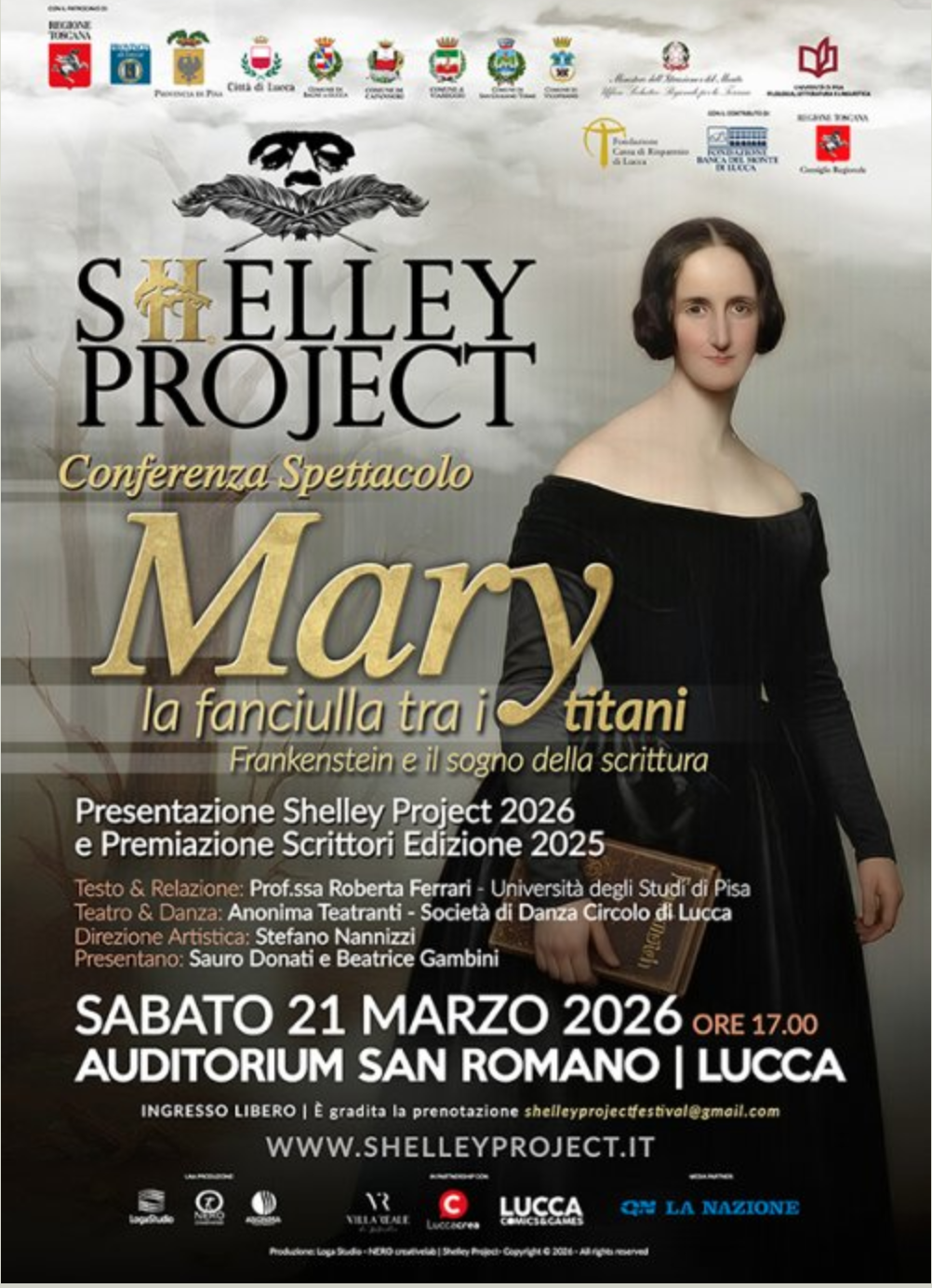 The opening event of the Shelley Project 2026 will be held on March 21st at 5:00 PM at the San Romano Auditorium in Lucca. The lecture-performance "Mary: The Girl Among the Titans - Frankenstein and the Dream of Writing," curated by Professor Roberta Ferrari of the University of Pisa, will feature artistic performances by Anonima Teatranti and the Società di Danza – Circolo di Lucca.