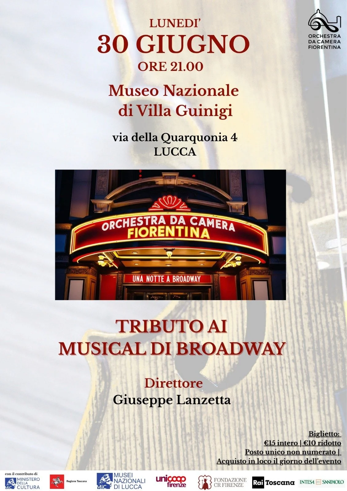 Tribute to the Broadway Musical Monday 30 June 2025 21:00 Tuesday 1 July 2025 22:30 Museo Nazionale Villa Guinigi 4 Via della Quarquonia Lucca, Toscana, 55100 Italy (map) Google Calendar ICS "Tribute to the Broadway musical", directed by Maestro Giuseppe Lanzetta, is the concert that awaits you at the #museovillaguinigi on Monday 30 June at 9 pm. Tickets €15,and €10 MORE INFO